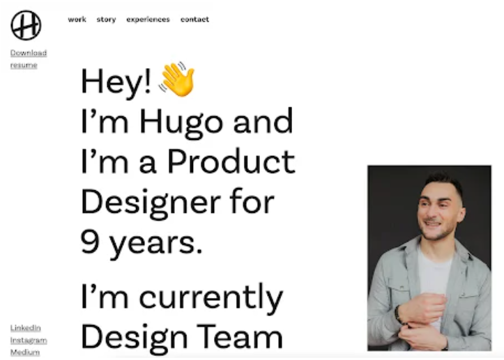 Consider Hugo Basin’s personal website for an example. The homepage is clear, with just four lines depicting what Hugo does and how he can help you.